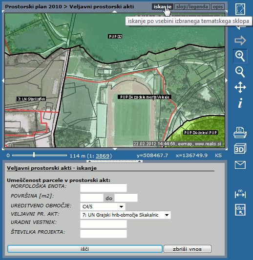 Pri nekaterih tematskih sklopih je omogočeno specifično iskanje lokacij in opisnih vrednosti po slojih, vsebovanih v tematskih sklopih.