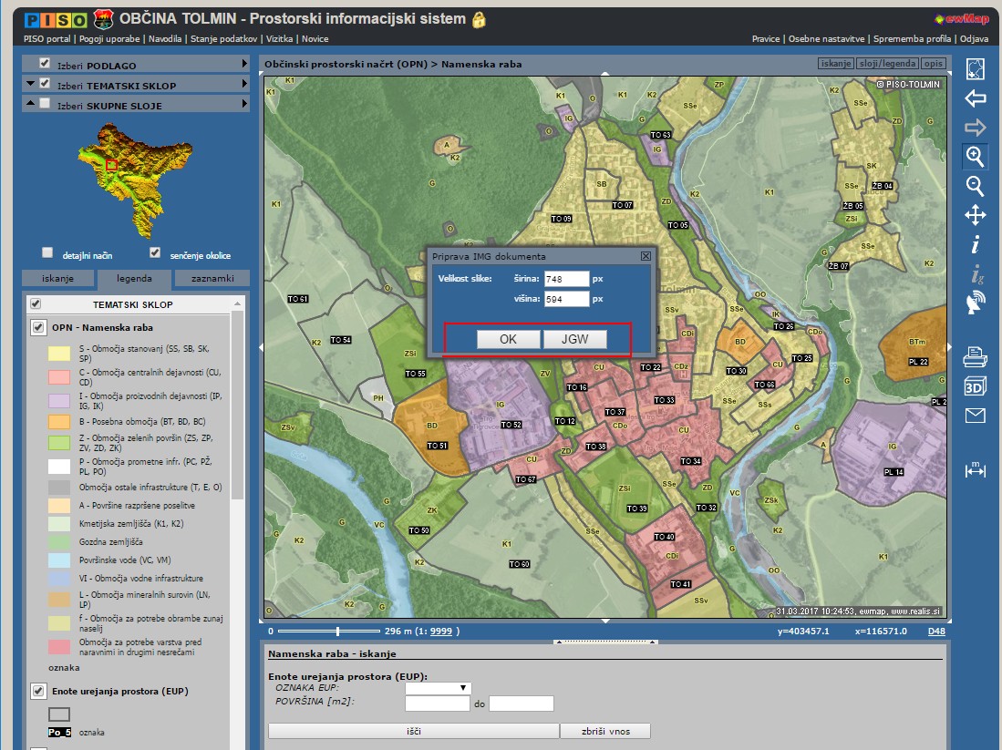 - kliknemo OK za prenos JPG slike ter JGW za prenos dodatka k sliki, ki omogoča delo v GIS programih, npr. ArcMap, QGIS itd. (slika 5)