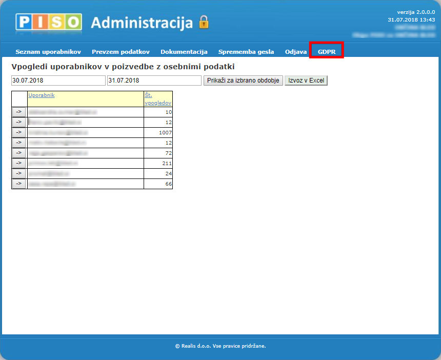 Beleženje vpogledov internih PISO uporabnikov v poizvedbe z osebnimi podatki Skladno z evropsko direktivo o varovanju podatkov (GDPR) imajo administratorji sistema PISO na voljo pregled nad številom vpogledov internih PISO uporabnikov v poizvedbe z osebnimi podatki. Seznam vpogledov je na voljo preko PISO Administracije. 01. avgust 2018 14:01 Kategorije: Novosti Obvestila Prejšnja objava << >> Naslednja objava