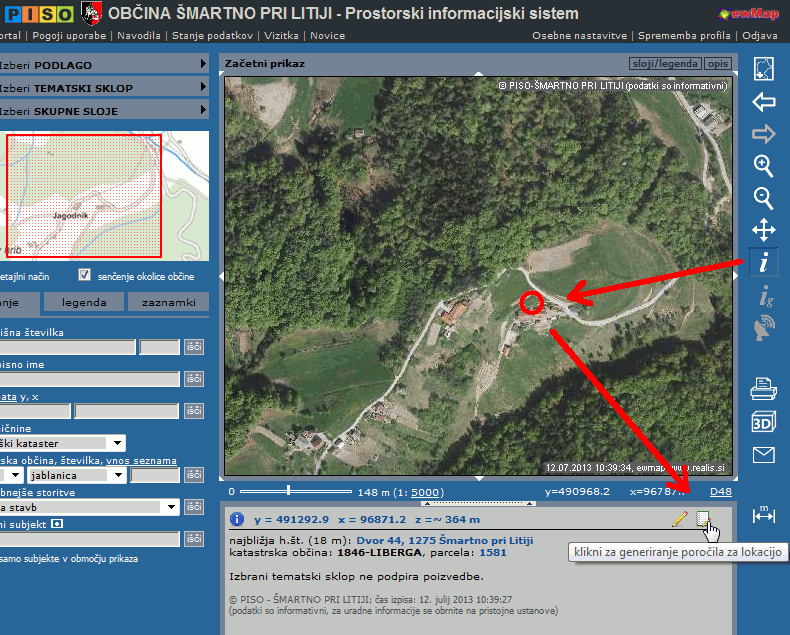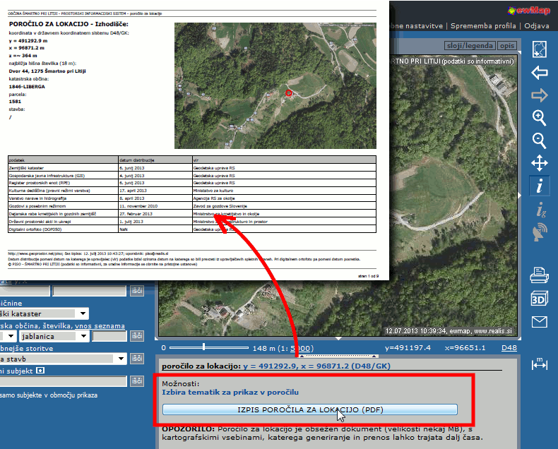 S klikom na ikono za poročilo (v desnem kotu tekstovnega dela) imamo možnost generiranja poročila za lokacijo v PDF formatu - omogočen je tudi izbor tematik, ki bodo del poročila.