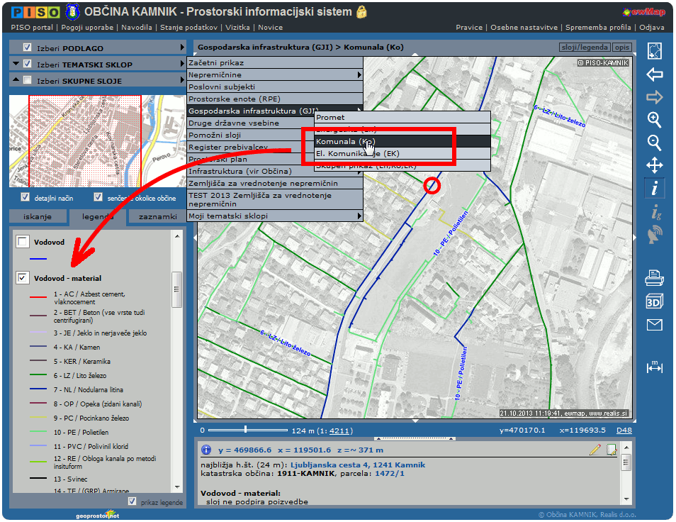Prikazane so osi posameznih vodov glede na material, ki je vpisan v ZK GJI. Sloja sta v tematskem sklopu privzeto izklopljena, potrebno ju je vključiti v legendi.