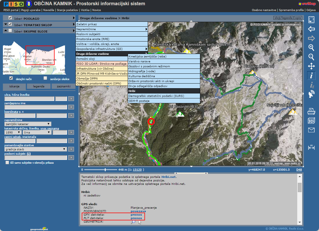 Z lokacijsko poizvedbo, oziroma klikom na želeno pot, se izpišejo podatki in povezava za prenos v GPX in PLT obliki.