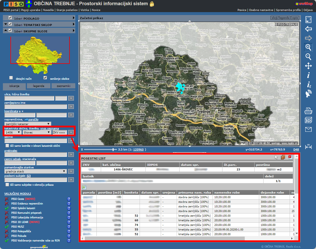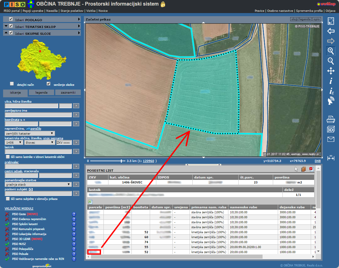 Če kliknemo na posamezno parcelo v seznamu, se prikaz avtomatično premakne na parcelo, le ta pa se pikčasto označi.