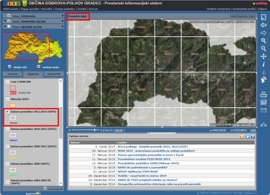 Za ogled datuma posameznega lista ortofota moramo imeti izbrano podlago »Letalski posnetek (DOF)«, izbran tematski sklop »Pomožni sloji« ter v legendi izbran ustrezen tematski sloj »Datumi posnetkov...«