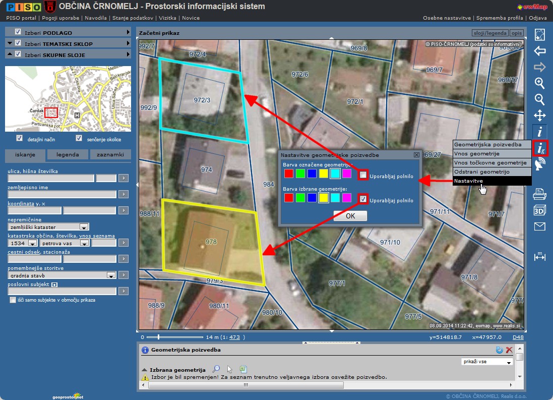Poleg spreminjanja barve (nasvet KAKO spremeniti barvo geometrije ) lahko označenim ali izbranim elementom na karti (npr. parcelam) urejamo tudi izris polnila.