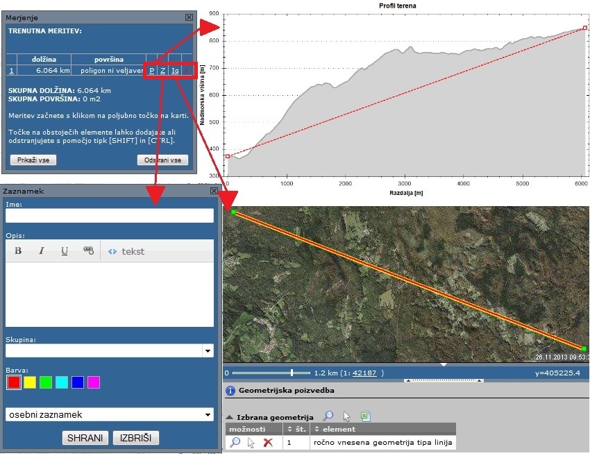 Poleg same izmere razdalj in površin nam orodje za merjenje omogoča tudi izdelavo vzdolžnega profila terena, prenos meritve v izbor za namen izvajanja geometrijske poizvedbe, shranitev meritve kot grafično opombo/zaznamek in odstranitev posamezne ali vseh meritev.