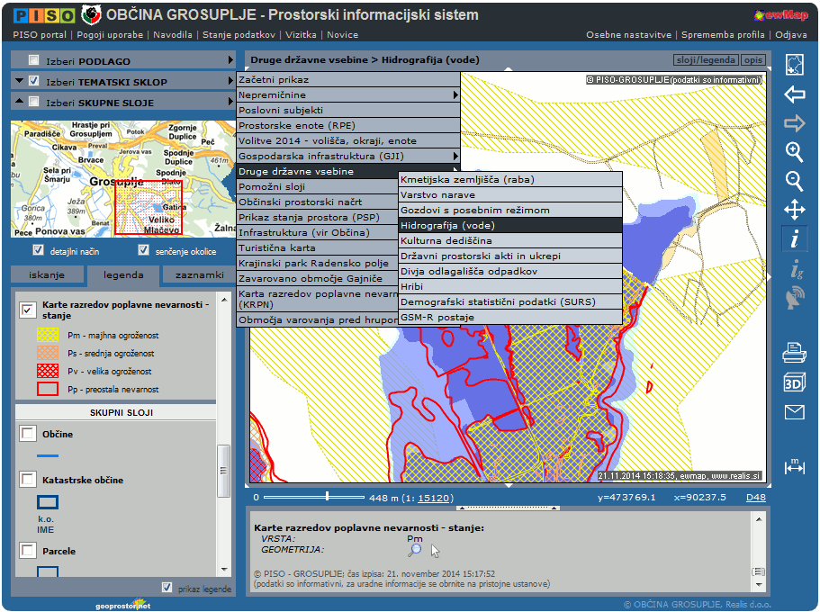 PISO-va najobširnejša zbirka prostorskih podatkov na državnem ter občinskem nivoju za občine že dalj časa vključuje tudi sloj "Karte razredov poplavne nevarnosti - stanje".