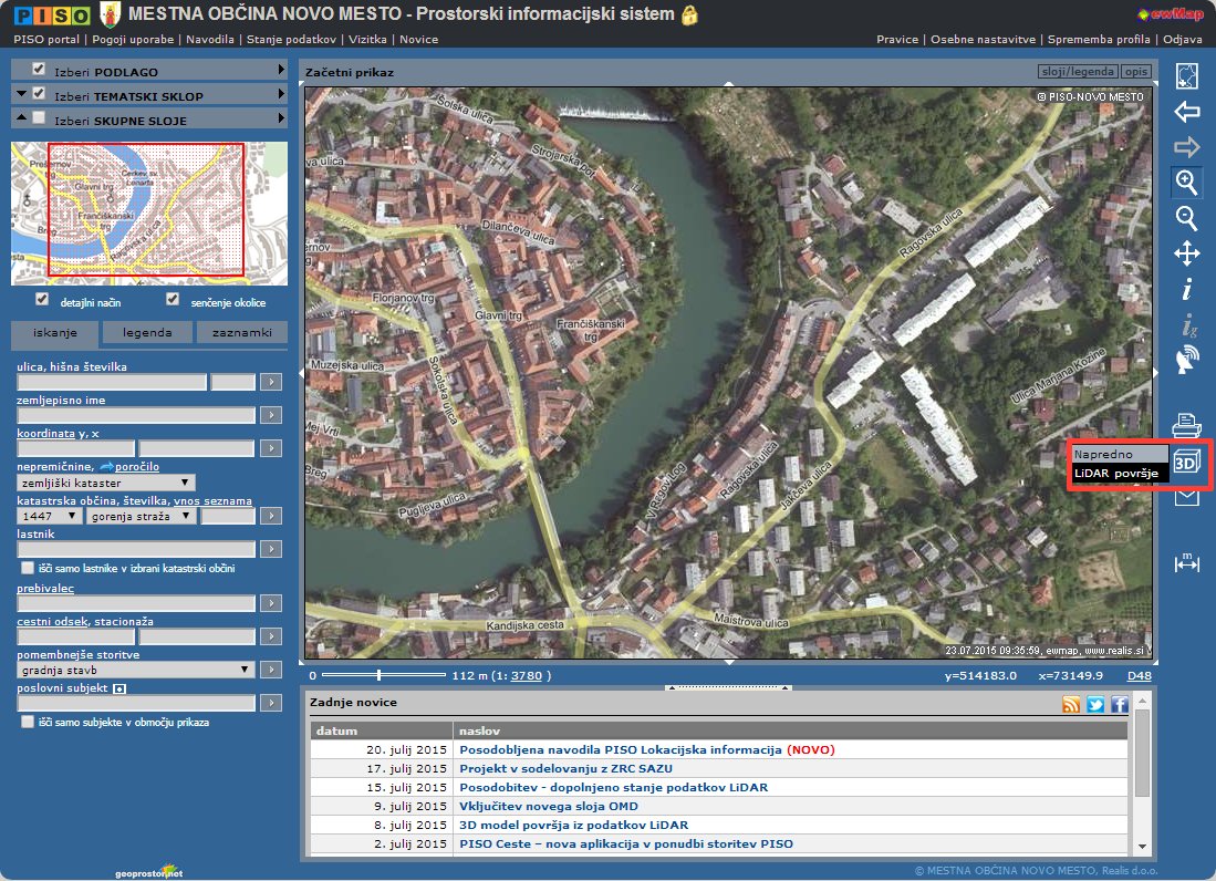 V PISO Spletni pregledovalnik smo vključili možnost 3D prikaza »LiDAR površje«* (več o tem). Za ogled 3D prikaza se z miško pomaknemo na ikono v orodni vrstici ter izberemo možnost »LiDAR površje«.