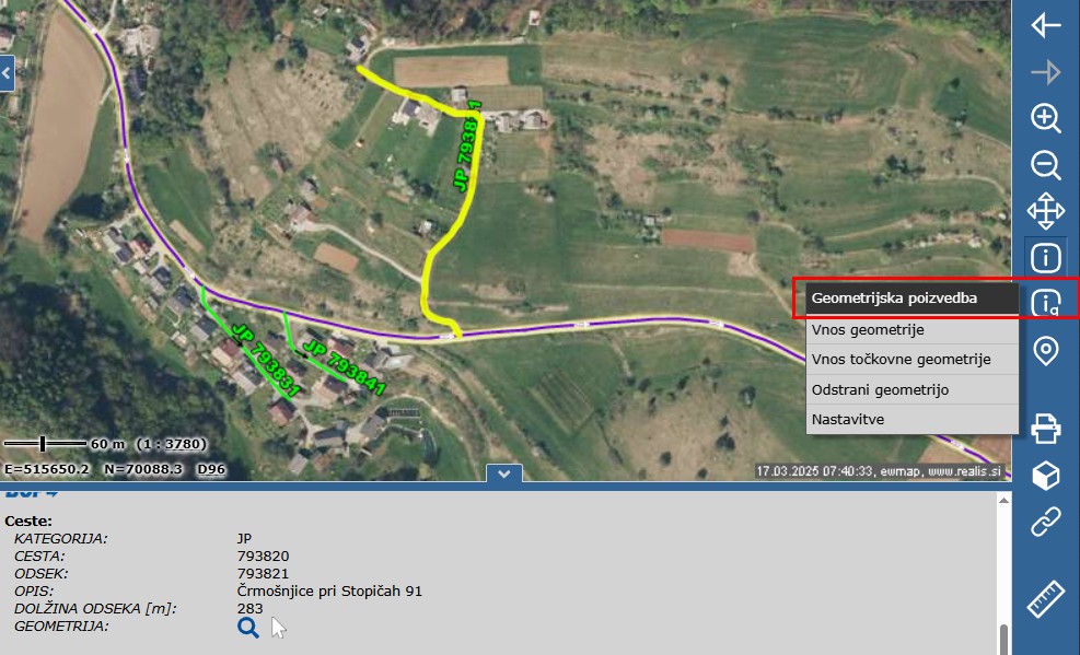 | 1. Z lokacijsko poizvedbo kliknemo na element. Pod karto se izpišejo podatki in kliknemo na ikono za izbor geometrije. |