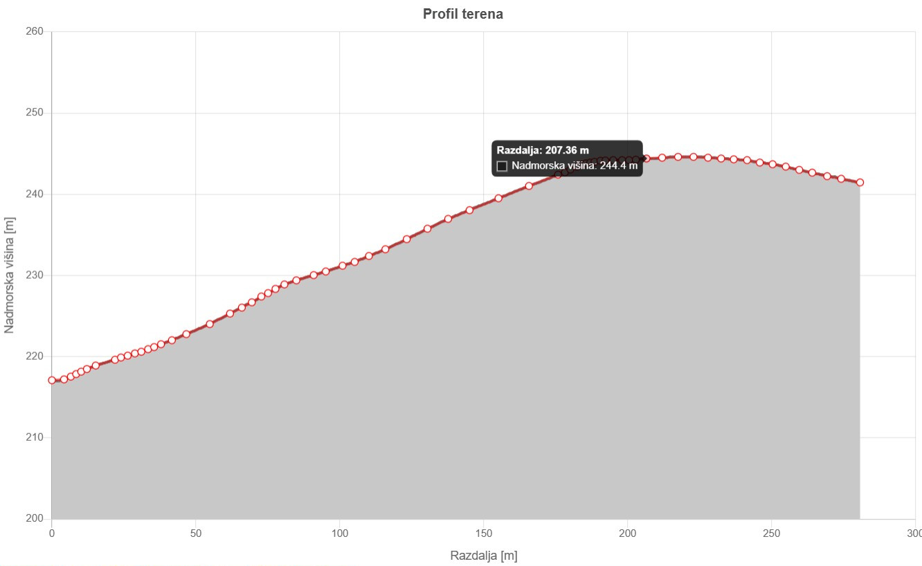 | 4. V novem oknu se odpre interaktivni profil, ki omogoča prikaz nadmorske višine od začetne točke elementa. |