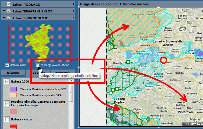 Okolica pogleda/občine je privzeto prekrita z nekoliko prosojno masko/senco. Z odznačitvijo te možnosti pod preglednim prikazom (pod majhno karto občine) to masko lahko odslej izklopimo.