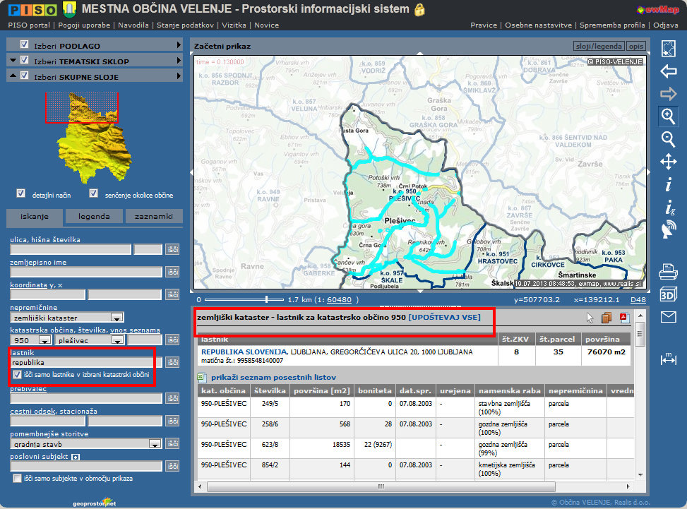 Na željo uporabnikov se sedaj pri iskanju po lastniku ZK in kadar se označi "išči samo lastnike v izbrani katatrski občini" prikažejo na karto in v seznamu samo parcele oz. posestni listi izbrane katastrske občine. Tako imamo nov tip izpisa za določenega lastnika samo znotraj izbrane katastrske občine.