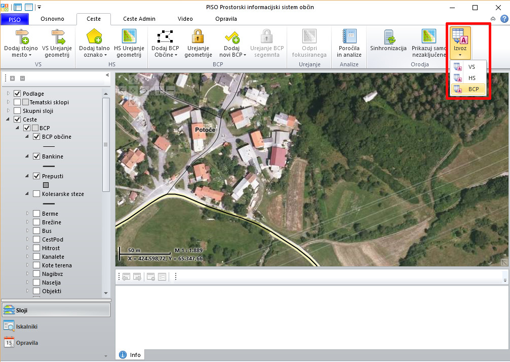 V aplikaciji PISO Ceste smo posodobili orodje za izvoz podatkov BCP v *.mdb (Access) datoteko. Aplikacija med drugimi funkcionalnostmi omogoča urejanje banke cestnih podatkov (BCP), tako grafično, kot atributno in izvoz podatkov v predpisani obliki za oddajo na Direkcijo RS za infrastrukturo (DRSI).