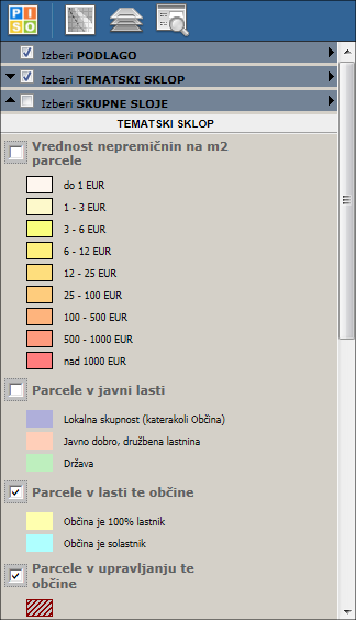 - iskanje lokacije (naslov, poslovni subjekti, parcele, stavbe, cestni odsek in stacionaža, prebivalci …);