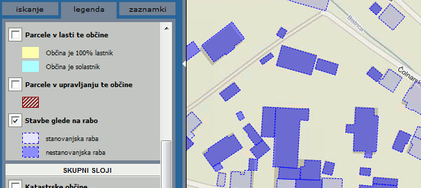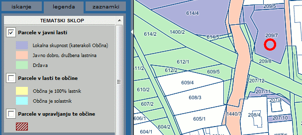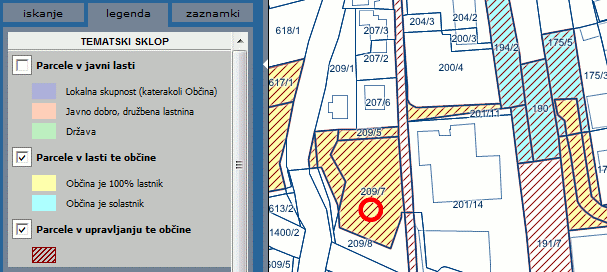 2. Parcele v javni lasti - parcele, pri katerih je kot lastnik navedena lokalna skupnost (katerakoli občina), Javno dobro ter Država (sloj je privzeto izklopljen v legendi);