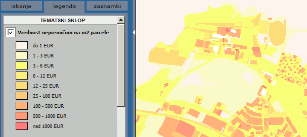 1. Vrednost nepremičnin na m2 parcele - parcele glede na ocenjeno vrednost nepremičnin iz postopka Vrednotenja nepremičnin Geodetske uprave RS (sloj je privzeto izklopljen v legendi);